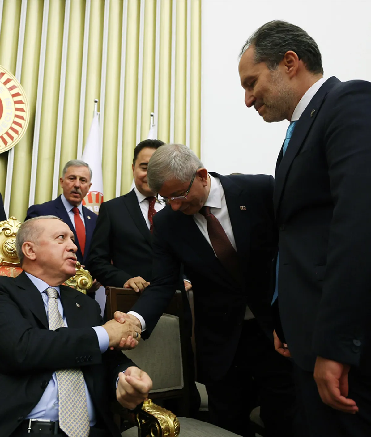 AKP-MHP dışındaki tüm partiler, Erdoğan’ı karşılayıp, açılış töreni sonrası düzenlenen resepsiyona katıldı. Resepsiyonda çekilen fotoğraflar günlerce konuşuldu ve hala konuşulmaya devam ediyor. Bu fotoğraflardan birinin başrol oyuncusu ise Gelecek Partili Ahmet Davutoğlu oldu.